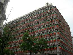 na imagem, edifício dum banco português engalanado de bandeiras nacionais aquando do Euro 2004. de futebol.